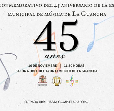 La Escuela Municipal de Música de La Guancha (EMLAGU) cumple 45 años, y queremos invitar a toda la comunidad a celebrarlo con nosotros. Durante casi medio siglo, esta escuela ha sido mucho más que un lugar de aprendizaje musical: ha sido el alma cultural de nuestro municipio, formando generaciones de músicos y transmitiendo el amor por el arte y la cultura.